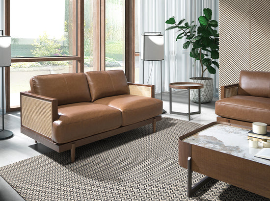 2 seater sofa of modern design upholstered in brown cowhide leather. Both for its style and its wooden legs in walnut colour, this sofa will bring a touch of avant-garde and elegance that you are looking for your home. A trendy sofa perfect for your seating area with an original rattan detail.