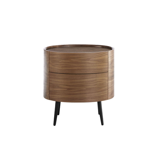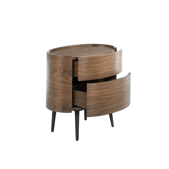Oval bedside table made of walnut veneered wood with 2 hidden drawers. Black stainless steel legs.