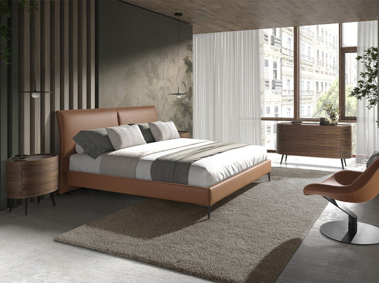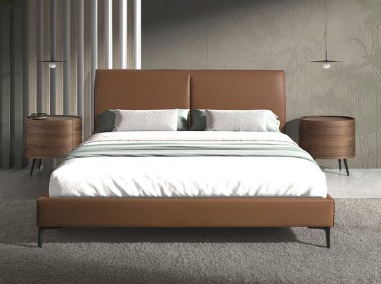 Oval bedside table with a modern design made of natural walnut veneer 0,5mm thick and original black stainless steel legs. An elegant and sophisticated style bedside table perfect to bring the touch of warmth and style you are looking for in your bedroom, as well as keeping everything in order thanks to its storage space with two hidden drawers with soft-closing system.