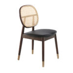 Solid ash wood dining chair painted in Walnut color with seat upholstered in black leatherette and backrest in rattan mesh. Seat filled with 25kg / m3 density injected polyether foam. Gold-colored steel legs detail.