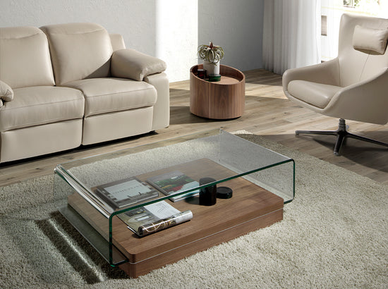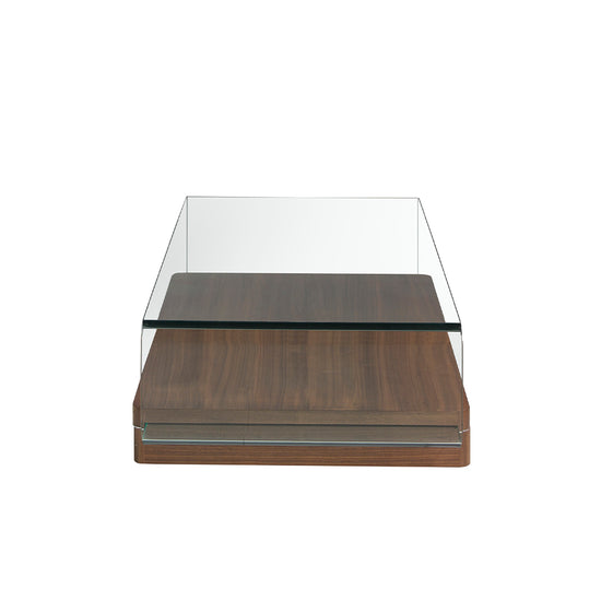 Curved tempered glass and walnut wood coffee table