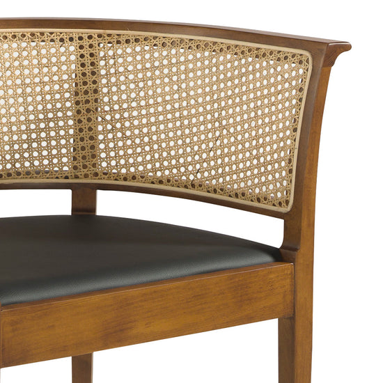 Walnut-coloured wooden chair. Seat upholstered in black eco-leather and backrest in rattan mesh.