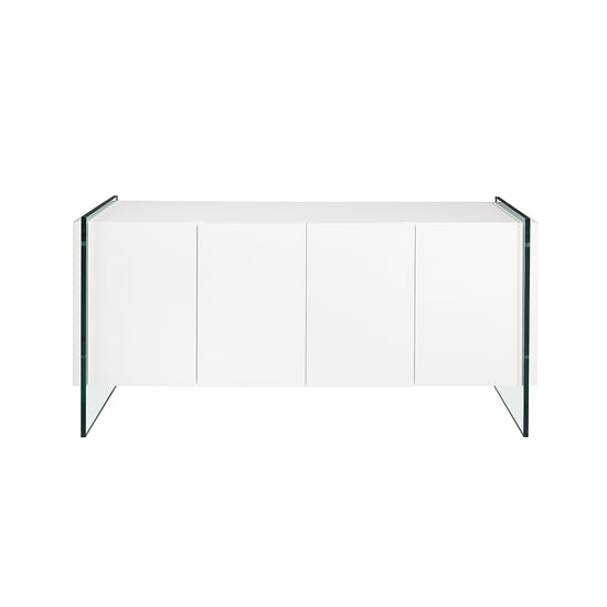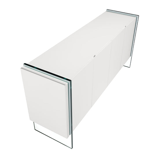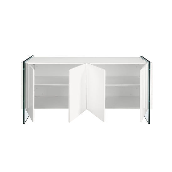 Sideboard with a MDF structure lacquered in Glossy White with four doors and interior shelves in MDF painted in white. Tempered glass sides.