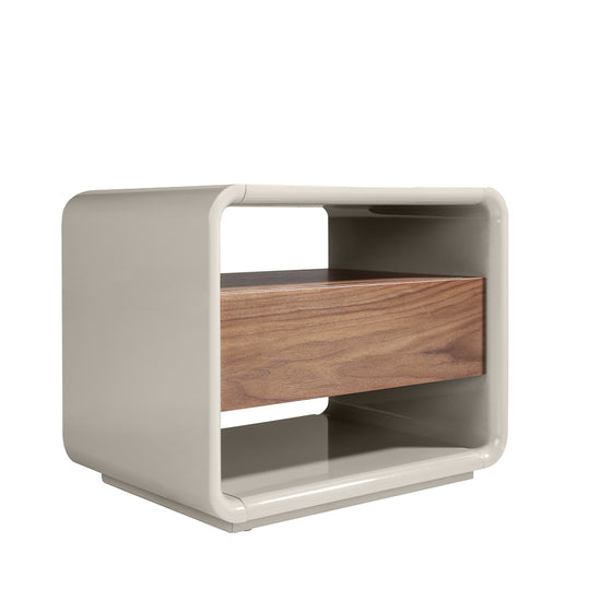 Bedside table in MDF wood lacquered in Gloss Mist Grey. Front drawer in natural walnut veneered wood and two storage compartments.