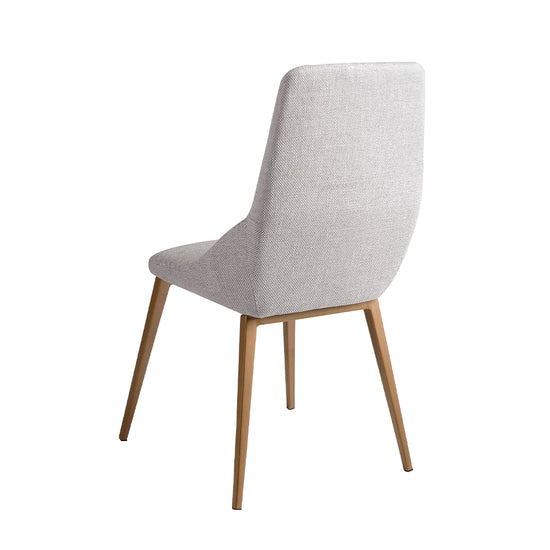 Modern design chair with seat and back upholstered in light grey fabric. Its gold-coloured stainless steel legs with an avant-garde yet timeless metal finish will make it a must-have for your kitchen or dining room. This chair by Angel Cerd combines the unique and personal style of the brand, as well as the highest comfort and stability, thanks to the high quality of its upholstery and the original structure of its legs.