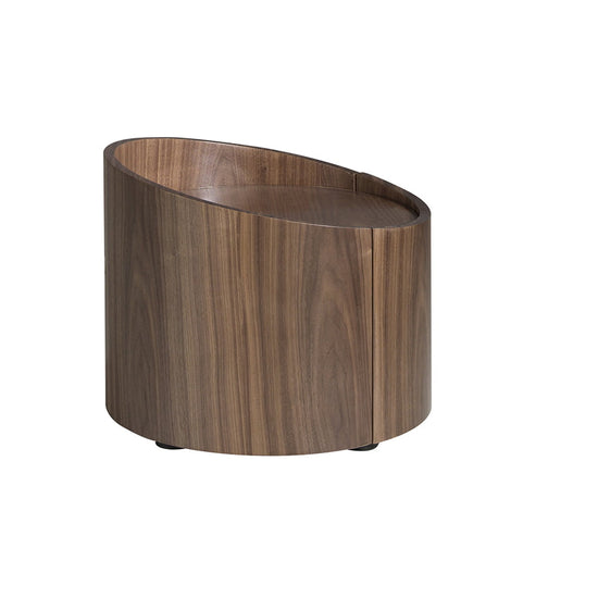 Round bedside table with a modern design and an original structure made of natural walnut veneered wood of 0,5mm thickness. An elegant and sophisticated style bedside table perfect to bring the touch of avant-garde and style you are looking for for your bedroom, as well as to keep everything in order thanks to its storage space with a pull-out drawer and soft-closing system.