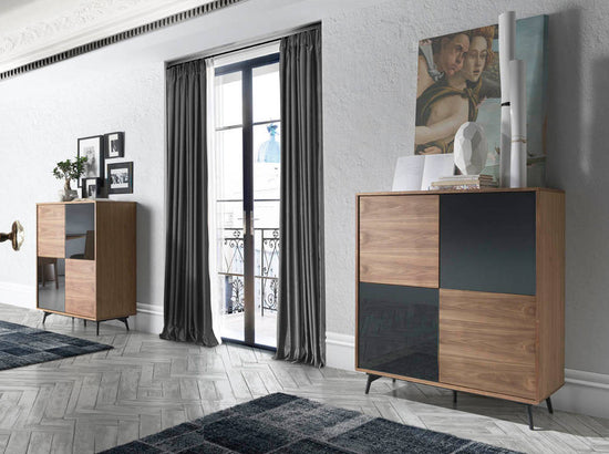 Walnut sideboard and black mirror glass model 3059 Angel Cerda S.L.Modern design sideboard with a 0.5mm thick natural walnut veneered wooden structure and black epoxy painted steel legs, with two elegant mirrored black tempered glass doors, and two walnut veneered with push system and soft closing -closing, with which you will get that sophisticated look you are looking for in your living room. Keep everything in its place thanks to its large storage space and matching interior shelves made of 0.5mm thick walnut veneered wood. STYLE: This elegant walnut sideboard with a modern design will provide the different and elegant touch you are looking for in your home, faithful to the latest trends in decoration. MULTIESTANCE: Versatile and functional, its design allows it to fit into any type of living room or dining room. QUALITY: All our sideboards are made with the highest quality materials, being a guarantee of durable and functional furniture. DECORATION AND COMFORT: Due to its design with straight lines, as well as its original combined doors in walnut and black mirror-effect glass, you will get the touch of modernity and warmth that you are looking for in your dining room. DIMENSIONS: Both for its size and its large storage space with four doors with push opening system and soft-closing closure, and matching interior shelves, it is ideal for keeping everything in order and in its place.