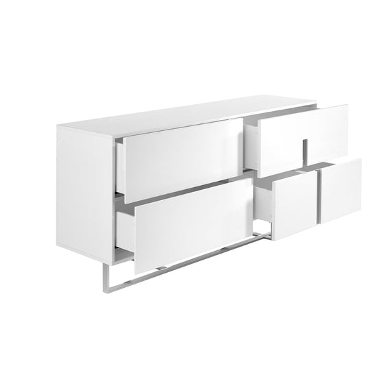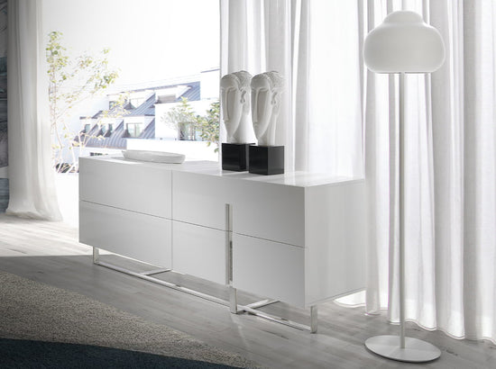 White sideboard with steel legs model 3052 Angel Cerda S.L.Sideboard with a modern design and simple lines with a DM structure lacquered in RAL9003 White Glossy and an original structure of legs and trim in 22 micron chromed stainless steel. Create a unique and different atmosphere with this sideboard, and it provides a feeling of spaciousness and light, keeping everything in order with its large storage capacity thanks to its four double drawers with soft-closing system. STYLE: This original sideboard with a modern design will provide the different and elegant touch you are looking for in your home, faithful to the latest trends in decoration. MULTIESTANCE: Versatile and functional, its design allows it to fit into any type of living room or dining room. QUALITY: All our sideboards are made with the highest quality materials, being a guarantee of durable and functional furniture. DECORATION AND COMFORT: Due to its straight lines design, as well as its white lacquered finish and chromed steel, you will achieve the spacious and luminous effect you are looking for in your dining room. DIMENSIONS: Both for its size and for its large storage space with four double drawers with soft-closing system, it is ideal for keeping everything in order and in its place.