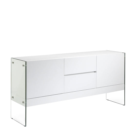 Sideboard with structure in Glossy White lacquered MDF with two doors and two drawers and interior shelves in Glossy White lacquered MDF. Tempered glass sides.