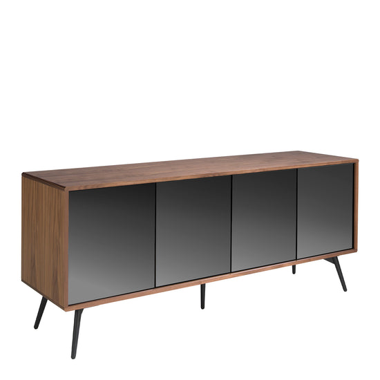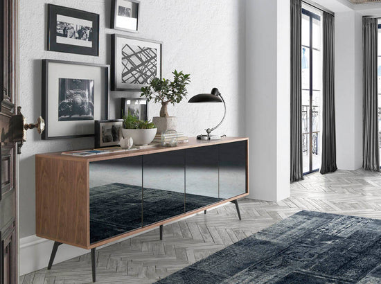 Modern design sideboard in 0.5mm thick natural walnut veneered wood, with black epoxy painted steel legs and four elegant mirrored black tempered glass doors with push opening system and soft-closing closure, with which you will get that sophisticated look you are looking for for your living room. Keep everything in its place thanks to its large storage space and matching interior shelves in 0.5mm thick natural walnut veneered wood.