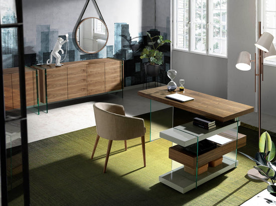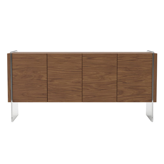 Modern design sideboard made of 0.5mm thick natural walnut veneered wood and original 12mm tempered glass side legs and polished edges. An elegant and sophisticated sideboard that is perfect for adding the touch of warmth and style you are looking for to your room, as well as keeping everything in order thanks to its large storage space with four doors with soft-closing system and matching interior shelves. in wood veneered in natural walnut 0.5mm thick.