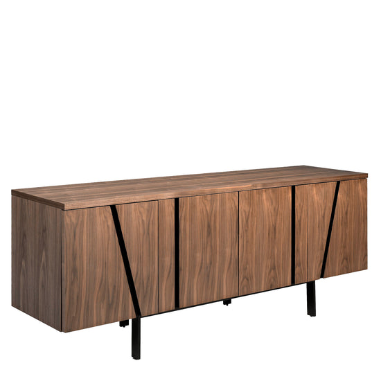 Walnut and black steel sideboard model 3124 Angel Cerda S.L.Sideboard with a modern design and simple lines made of 0.5mm thick American walnut veneered ash wood. Its details and structure of legs in steel painted in black epoxy, provide that minimal and industrial touch to the furniture. It is a sideboard in which practicality and functionality stand out, thanks to its four folding doors and matching interior shelves in 0.5mm thick American walnut veneered ash wood, perfect for storing everything you need. STYLE: This original walnut sideboard with a modern design will provide the different and elegant touch you are looking for in your home, faithful to the latest trends in decoration. MULTIESTANCE: Versatile and functional, its design allows it to fit into any type of living room or dining room. QUALITY: All our sideboards are made with the highest quality materials, being a guarantee of durable and functional furniture. DECORATION AND COMFORT: Due to its design with straight lines, as well as its walnut finish and black steel details, you will get the different and personal touch that you are looking for in your dining room. DIMENSIONS: Both for its size and for its large storage space with four folding doors and matching interior shelves, it is ideal for keeping everything in order and in its place.