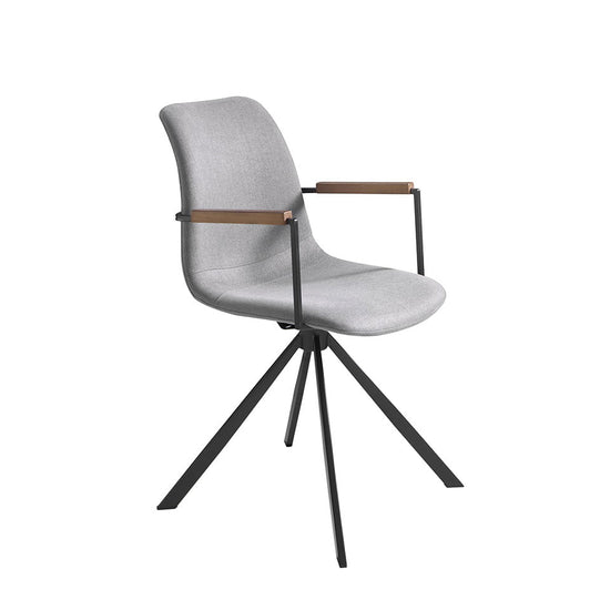 Fabric upholstered swivel chair with black steel legs and armrests in walnut wood
