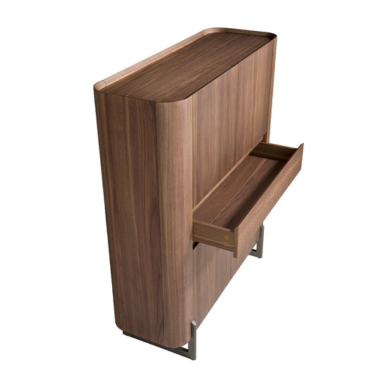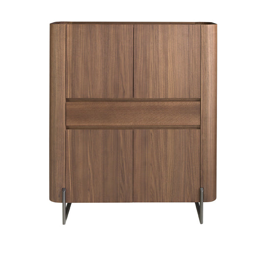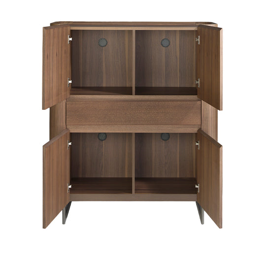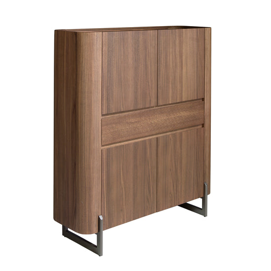 Tall sideboard with a modern design with a natural walnut veneered wood structure and original dark metallic stainless steel legs. It has a large storage space with 1 drawer with soft-closing system and 4 doors with hinge opening system and soft-closing system.
