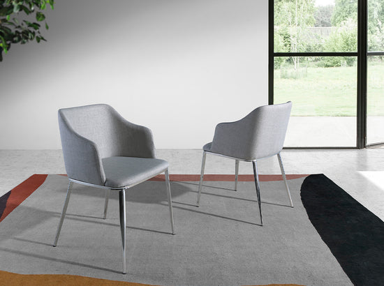 Gray fabric upholstered dining chair 4050 Angel Cerd S.L.Modern design dining chair with armrests upholstered in gray fabric. A contemporary and timeless style chair with 22 micron chrome steel legs that will become a must have in your dining room. Its backrest and seat in 25kg / m3 polyurethane foam and enveloping design gives it that unique and different style that you are looking for in your home, combining it with the greatest comfort. STYLE: This elegant dining chair with armrests upholstered in gray fabric with a modern design will provide the different and sophisticated touch you are looking for in your home, faithful to the latest trends in decoration. MULTIESTANCE: Versatile and functional in nature, its design allows it to fit into any type of living room or dining room, becoming the protagonists of the room. QUALITY: All our dining chairs are made with the highest quality materials, being a guarantee of durable and functional furniture. DECORATION: Its timeless design reflects the most original and personal touch of the Angel Cerd brand, as well as the most sophisticated style for your dining room. COMFORT: Due to its enveloping backrest, as well as the size of its seat and 25kg / m3 polyurethane foam padding, it will allow you to have maximum comfort, without neglecting the highest trend.