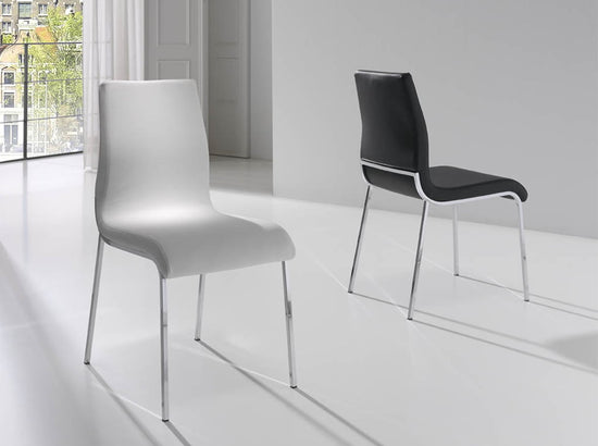 Black leatherette upholstered dining chair 4052 Angel Cerd S.L.Modern design dining chair upholstered in black leatherette. An avant-garde and contemporary chair with an elegant 22-micron chrome-plated stainless steel leg structure that will become a must-have in your dining room. Its backrest and seat in 25kg / m3 polyurethane foam gives it that unique style, as well as the greater comfort you need in your day-to-day life. STYLE: This original black dining chair with a modern design will provide the different and elegant touch you are looking for in your home, faithful to the latest trends in decoration. MULTIESTANCE: Versatile and multifunctional, its design allows it to fit into any type of living room, dining room or kitchen, becoming the protagonists of the room. QUALITY: All our dining chairs are made with the highest quality materials, being a guarantee of durable and functional furniture. DECORATION: Due to its simple design and its soft upholstery in black leatherette, you will get the different and distinctive touch you are looking for in your dining room. COMFORT: The size of its seat and its 25kg / m3 polyurethane foam padding will allow you to have maximum comfort, without neglecting the highest trend.