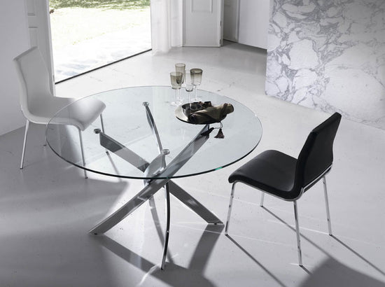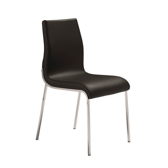 Dining chair upholstered in leatherette and chromed stainless steel frame.
