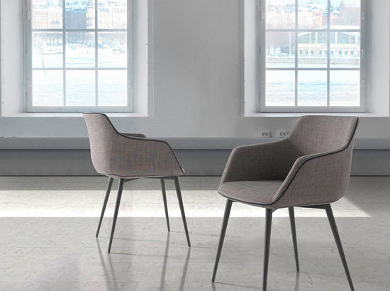 Modern design dining armchair with armrests upholstered in gray fabric and black piping. An avant-garde and contemporary style chair with black steel legs that will become a must have in your dining room. Its 25kg / m3 polyurethane foam seat and wraparound design give it that unique style and greater comfort.