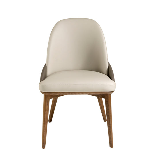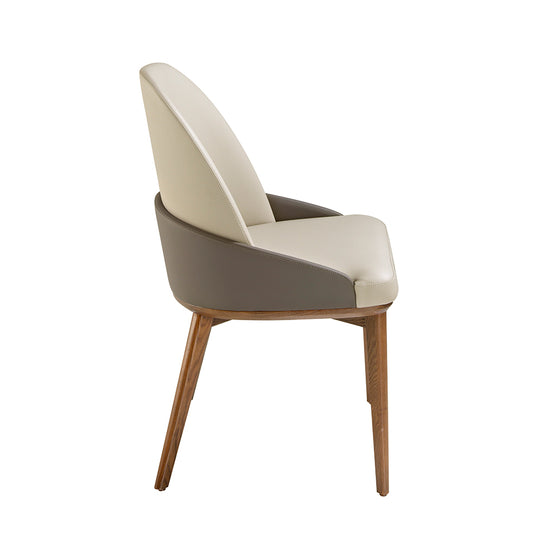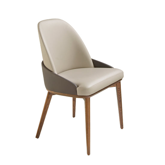 Dining chair upholstered in different shades of eco-leather. Leg structure in ash wood in walnut colour.