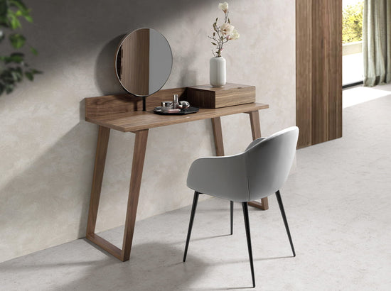 Walnut wood dressing table with mirror model 7000 Angel Cerda S.L.Dressing table with an original modern design made of 0.5mm thick natural walnut veneered wood. Thanks to its side drawer and rotating mirror, this dressing table is ideal to keep everything in its place, as well as to enjoy your personal care moment in a relaxed and calm way. A sophisticated and exclusive touch that you will not want to be missing in your bedroom. STYLE: This dressing table will add a modern touch to any type of room, with an ideal finish to add elegance and sophistication to your bedroom. MULTIESTANCE: Versatile and functional, its design allows it to fit into any space. QUALITY: All our dressing tables are made with the highest quality materials, guaranteeing durable and functional furniture. DECORATION AND COMFORT: This original walnut dressing table is the perfect option if what you are looking for is elegance and simplicity, as well as practicality for your rest area or dressing room. FUNCTIONALITY: The minimalist and modern style of this desk provides spaciousness and a feeling of warmth to the space, as well as greater functionality thanks to its side drawer and revolving mirror.
