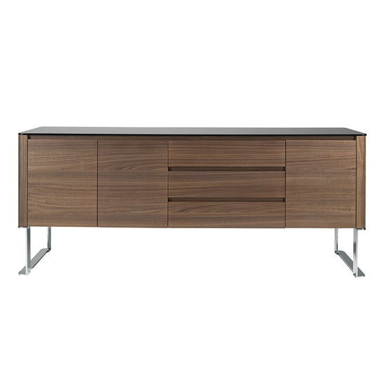 Walnut-veneered wooden sideboard with black-tinted tempered glass top. Doors and three central drawers and interior shelves in walnut-veneered wood. Chromed stainless steel legs.