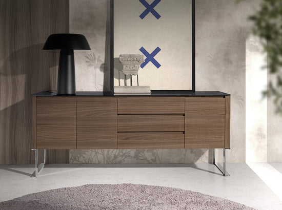 Walnut sideboard and black glass top model 3060 Angel Cerda S.L.Modern design sideboard in 0.5mm thick natural walnut veneered wood, with 22 micron chrome stainless steel legs, and an elegant black tinted tempered glass top cover, with which you will achieve that sophisticated look you are looking for your living room. Keep everything in its place thanks to its large storage space with doors and three central drawers with soft-closing system and matching interior shelves in 0.5mm thick walnut veneered wood. STYLE: This original walnut sideboard with a modern design will provide the different and elegant touch you are looking for in your home, faithful to the latest trends in decoration. MULTIESTANCE: Versatile and functional, its design allows it to fit into any type of living room or dining room. QUALITY: All our sideboards are made with the highest quality materials, being a guarantee of durable and functional furniture. DECORATION AND COMFORT: Due to its design with straight lines, as well as its elegant black tinted glass top, you will get the touch of modernity and warmth you are looking for in your dining room. DIMENSIONS: Both for its size and for its large storage space with three doors with push opening system and soft-closing closure, three drawers and matching interior shelves, it is ideal for keeping everything in order and in its place.